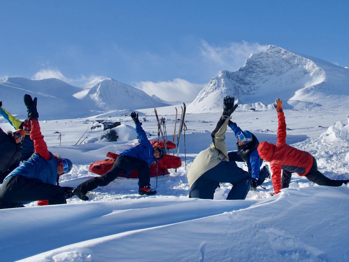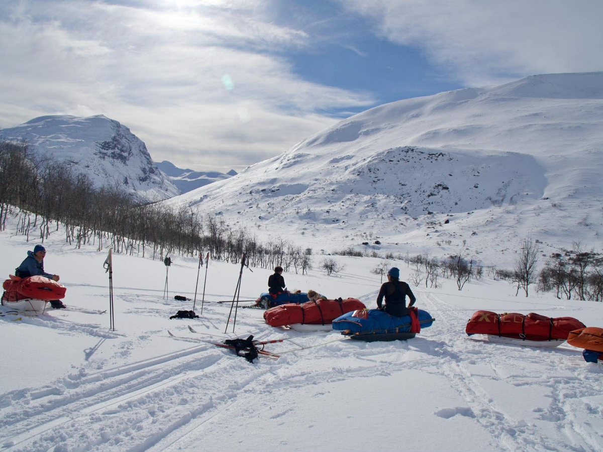 Nå er vi ankommet Ritsem i sol og har nytt Akkamassivet med en Nordlands Guld. I massivet finner man de høyeste toppene i Sarek. Vi har sittet på stoler, spist som siviliserte mennesker med kniv og gaffel og oppført oss pent. Heldigvis er det ut i terrenget igjen i morgen. Nå har vi proviantert, fyllt opp pulkene og setter nesen mot neste stopp som er Abisko. Der planlegger vi å være om 6-7 dager. Vi starter dagen i morgen med en scootertur til Sitasjaure, der er det på med skiene og videre mot nord!