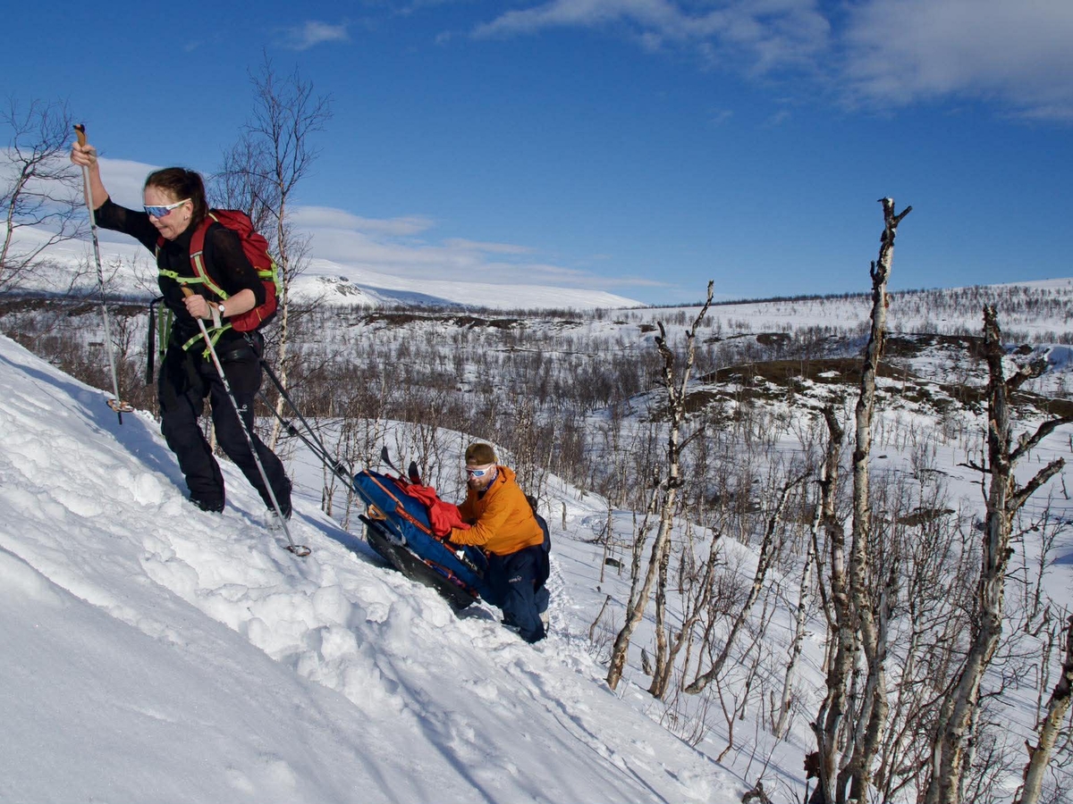 Nå er turen endelig i gang! Tyngdekraften dro hardt i pulkene i noen bratte kneiker ut fra Kvikkjokk. Men lekende lett kom vi oss opp og nå har vi satt turens første camp.
